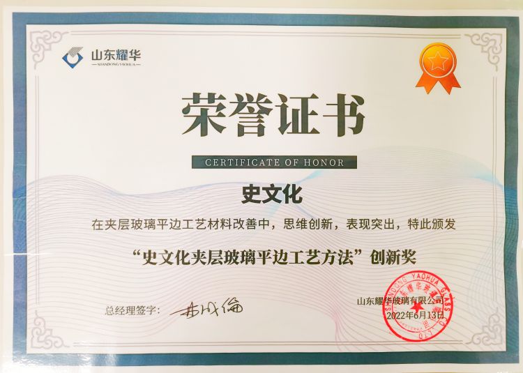 此项技术创新为夹层玻璃平边工艺方法,由生产中心提交技术创新实施方案及质量提升改进效果。公司技术创新评审小组根据验证结果评定奖励级别,并首次采用技术创新者姓名命名为“史文化夹层玻璃平边工艺方法”以兹鼓励。