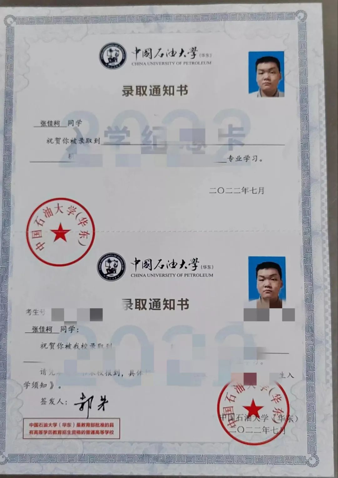 信息技术部张朝东爱子张佳柯中国石油大学(211学校)录取通知书